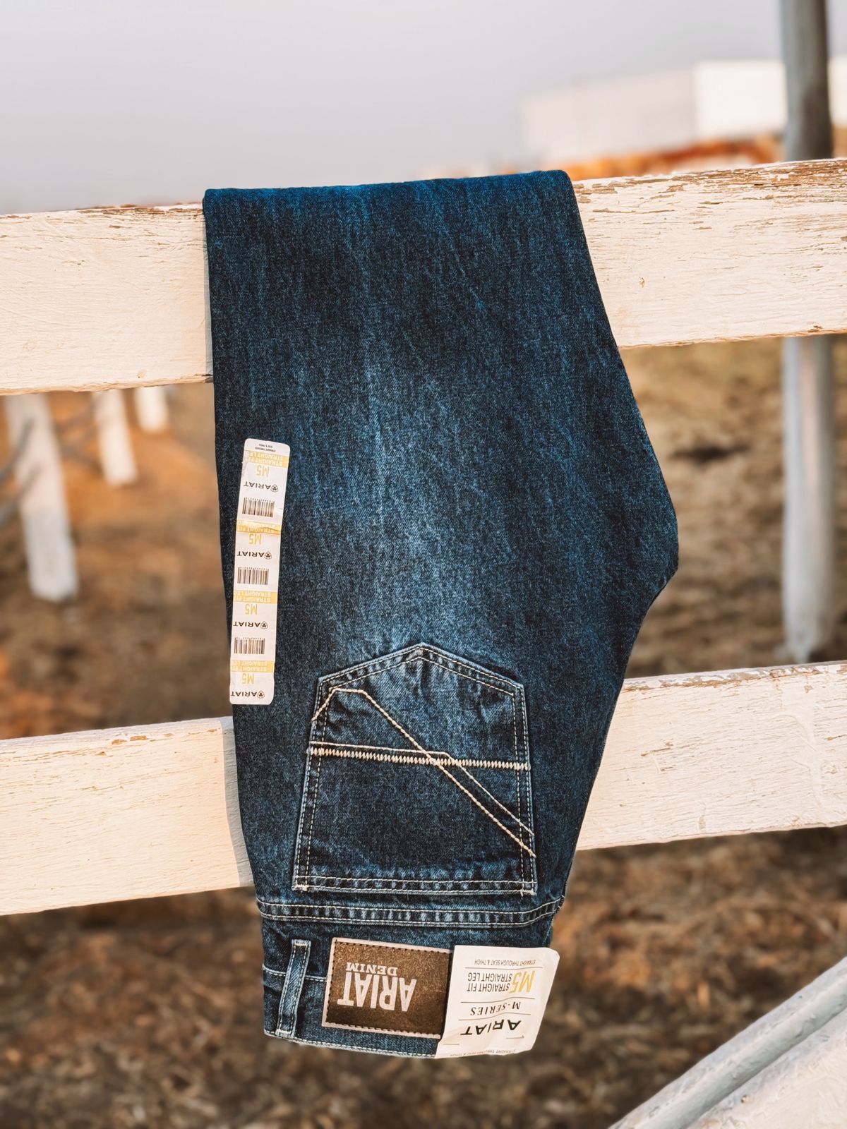 Jeans Ariat: Duas vezes mais duráveis com a quantidade certa de elasticidade, eles são relaxados nas coxas, no assento e na cintura, com uma perna reta que combina perfeitamente com suas botas favoritas.