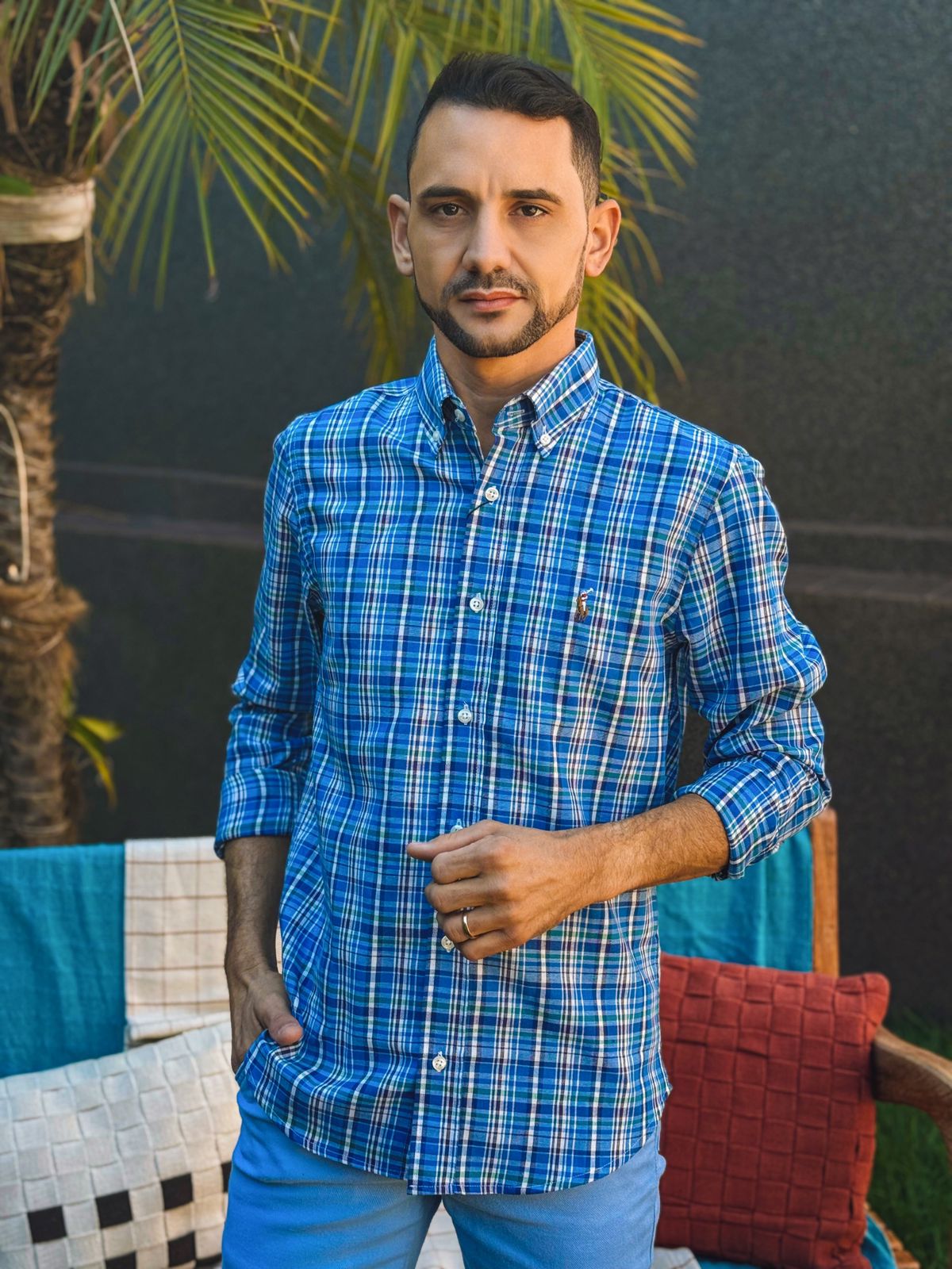 Camisa Oxford Ralph Lauren Masculina Manga Longa Custom Fit Xadrez Madras Azul/Branca Pony Colorido