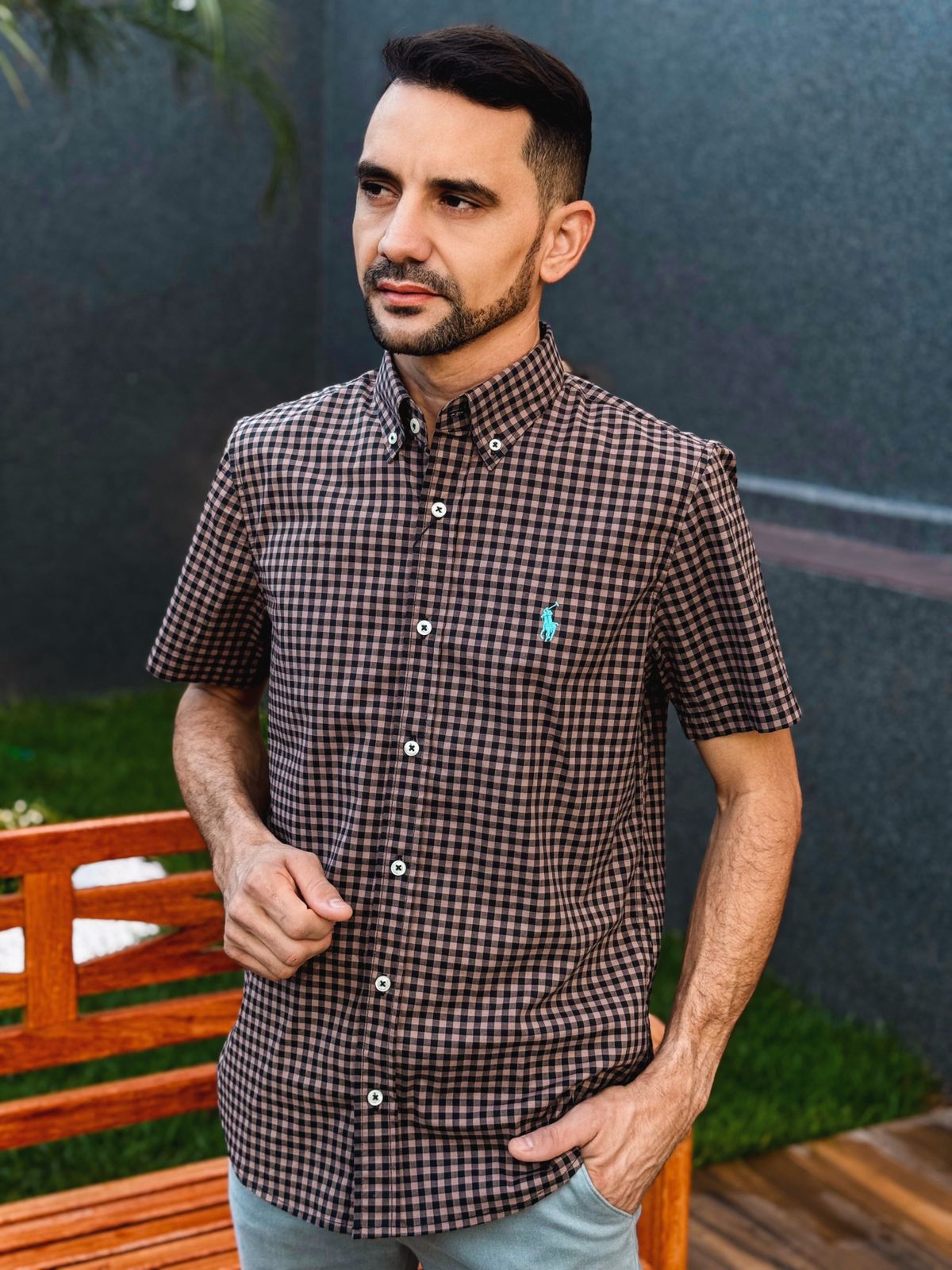 Camisa Ralph Lauren Masculina Manga Curta Custom Fit Micro Xadrez Marrom Chocolate Pony Verde Água