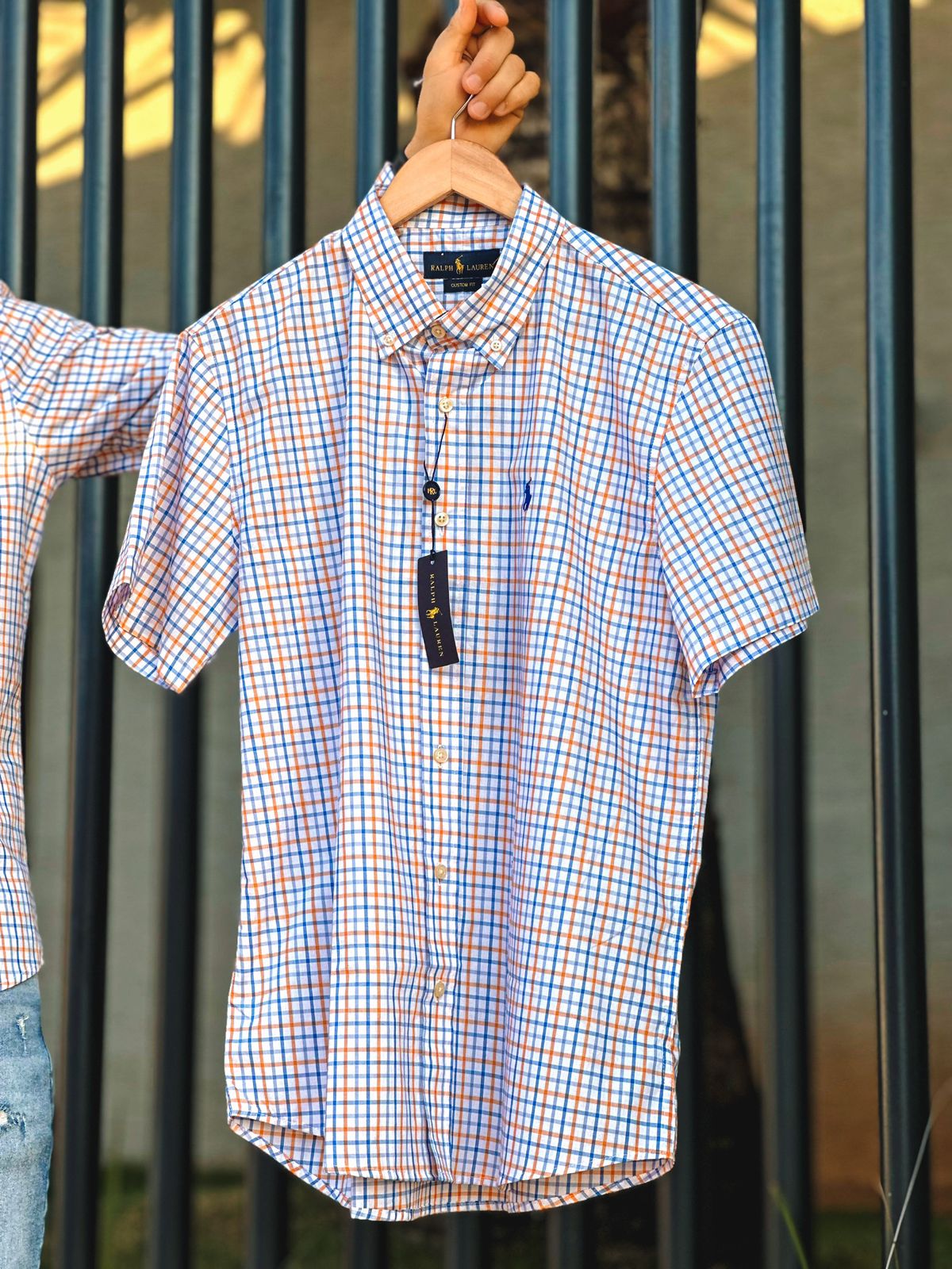 Camisa Ralph Lauren Masculina Manga Curta Custom Fit Xadrez Madras Laranja Pony Azul Bic