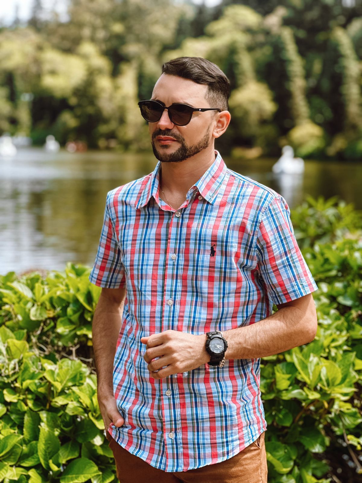 Camisa Ralph Lauren Masculina Xadrez Madras Vermelho/Azul Modelagem Custom Fit.