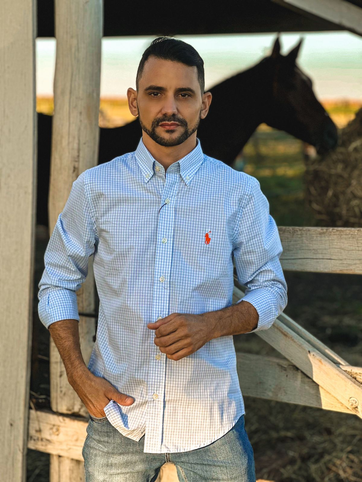 Camisa Ralph Lauren Masculina Micro Xadrez Azul Claro Modelagem Custom Fit.