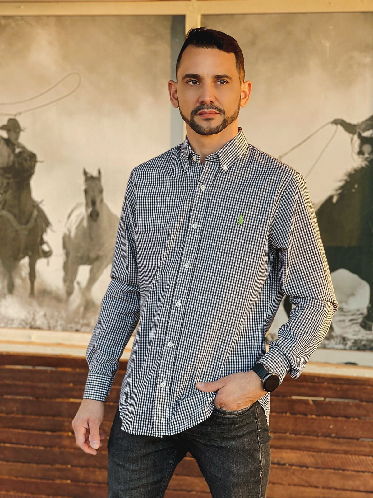 Camisa Ralph Lauren Masculina Manga Longa Custom Fit Micro Xadrez Preta Pony Lima