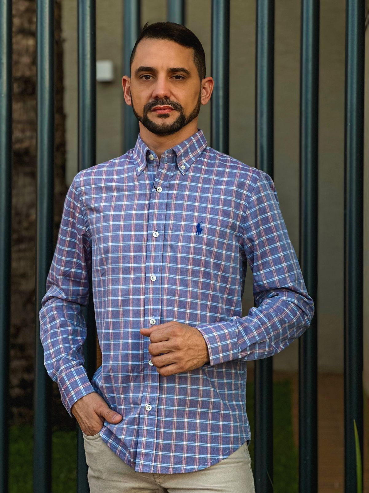 Camisa Ralph Lauren Masculina Xadrez Espaçado Ameixa Modelagem Custom Fit.