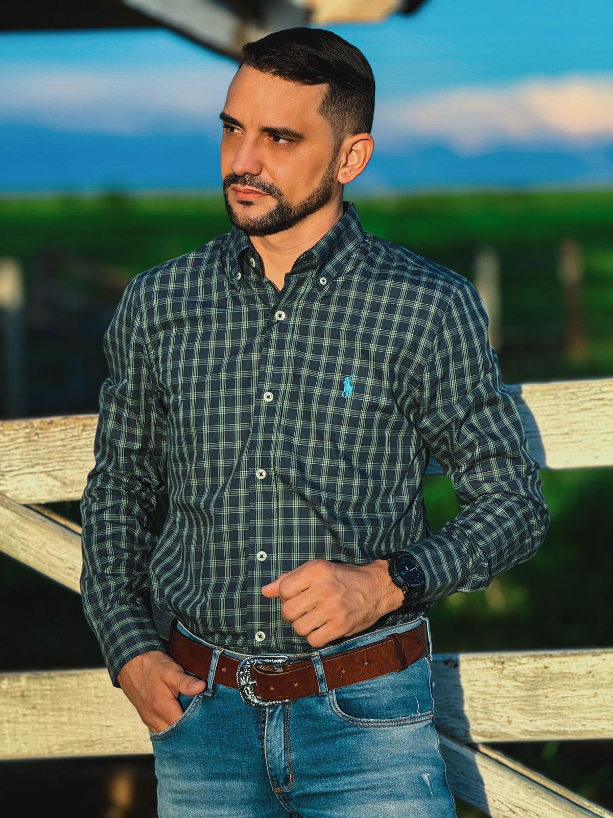 Camisa Ralph Lauren Masculina Xadrez Espaçado Preta C/ Verde Modelagem Custom Fit.